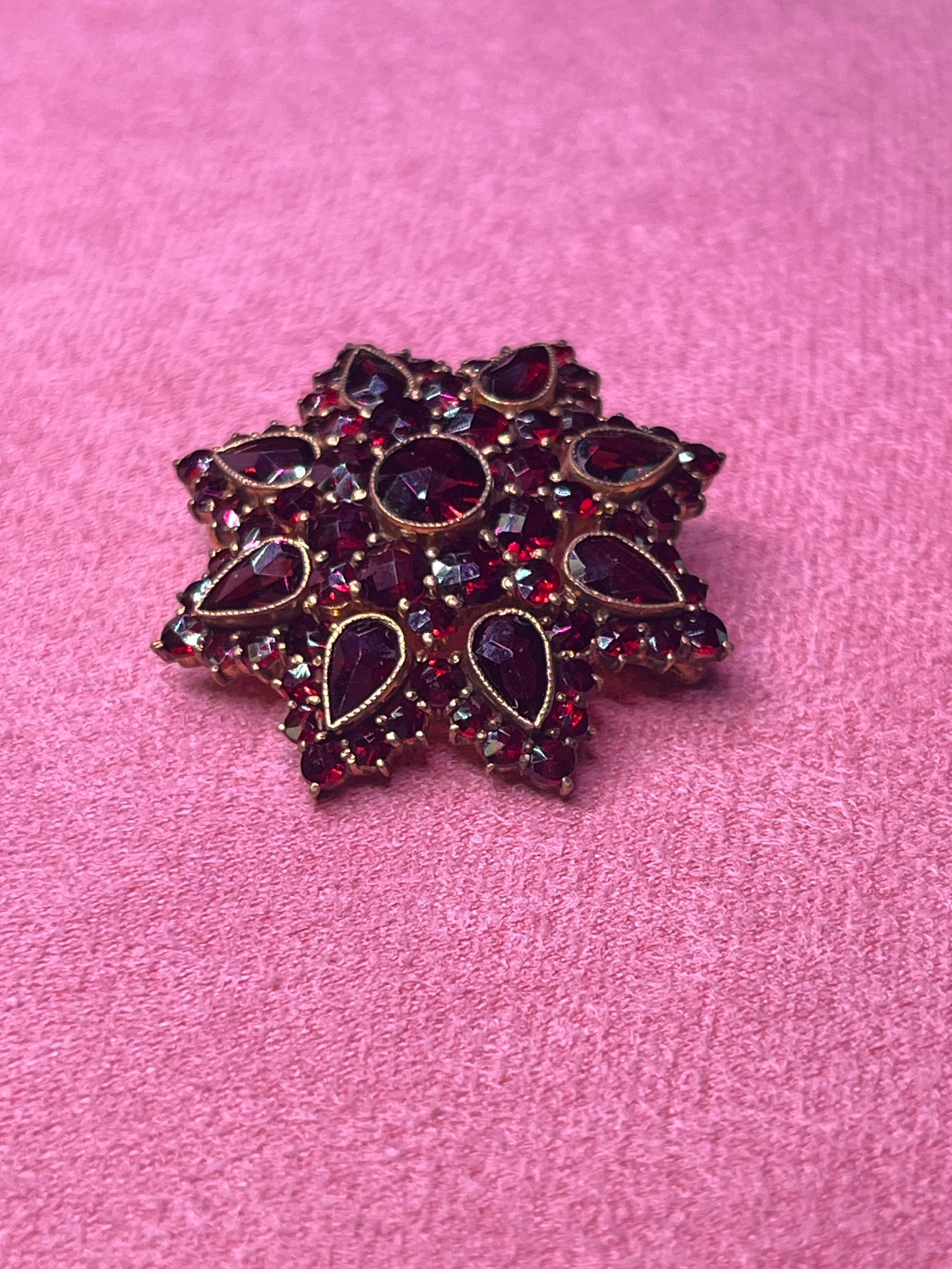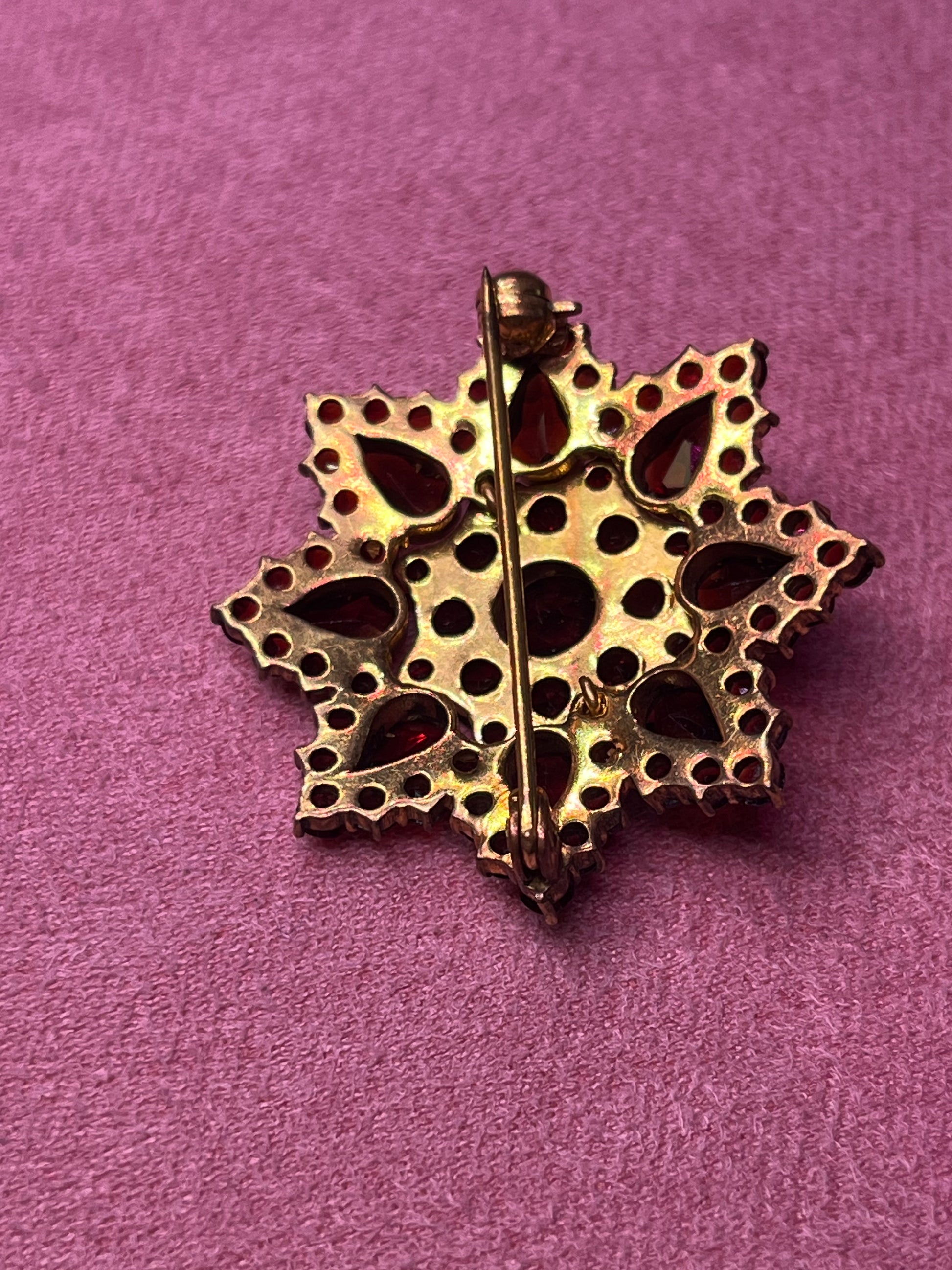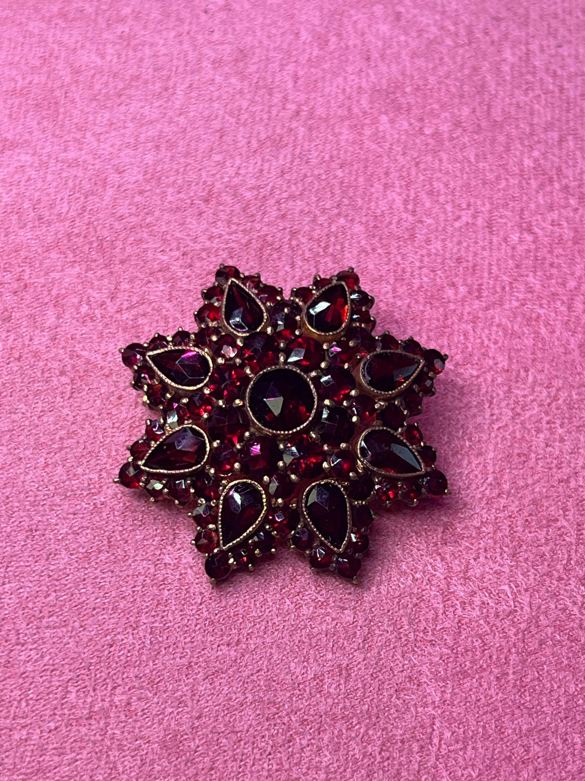 This Authentic Vintage Bohemian garnet pin features a stunning array of deep red garnets set in intricate gold-tone metalwork.