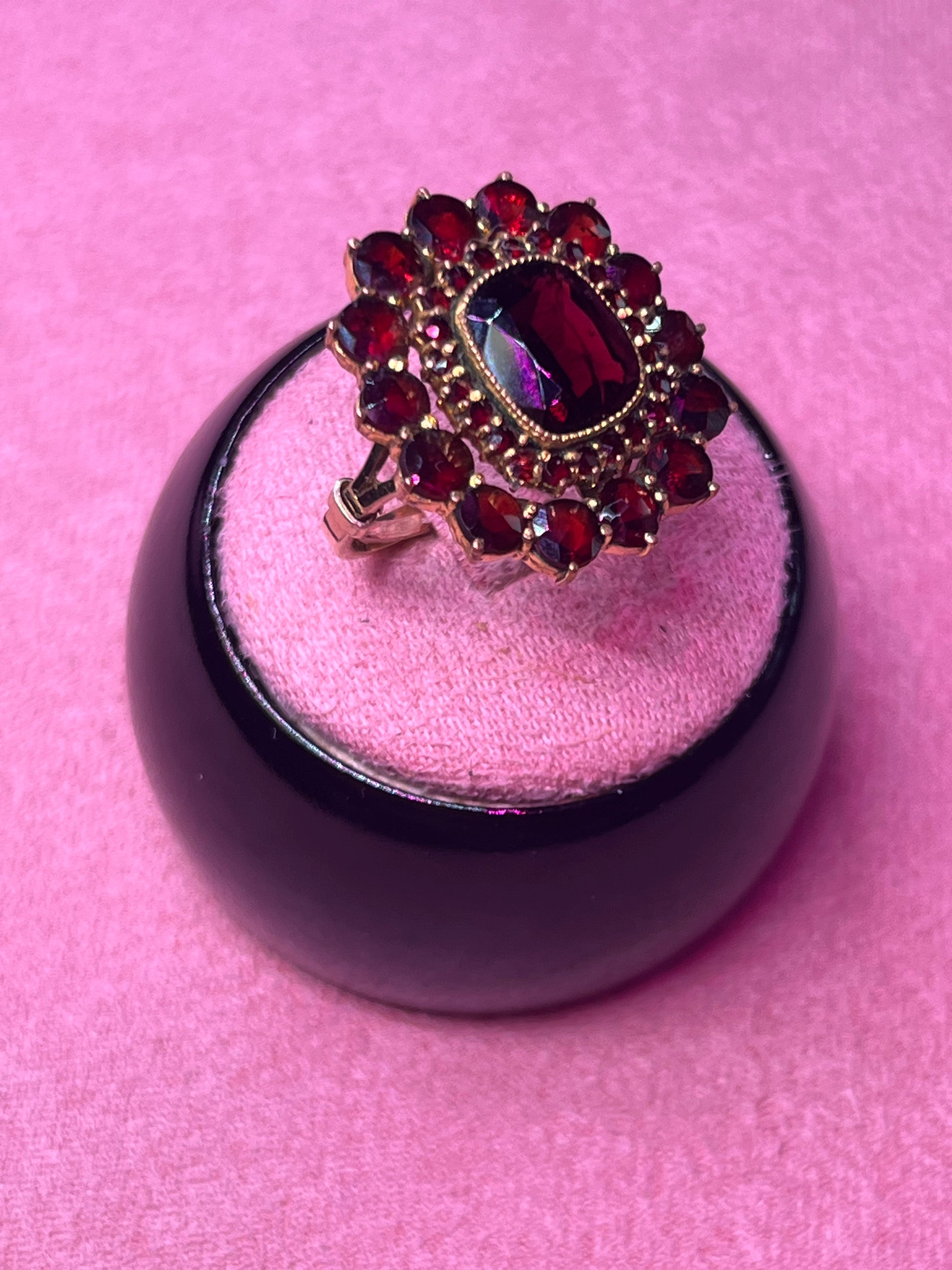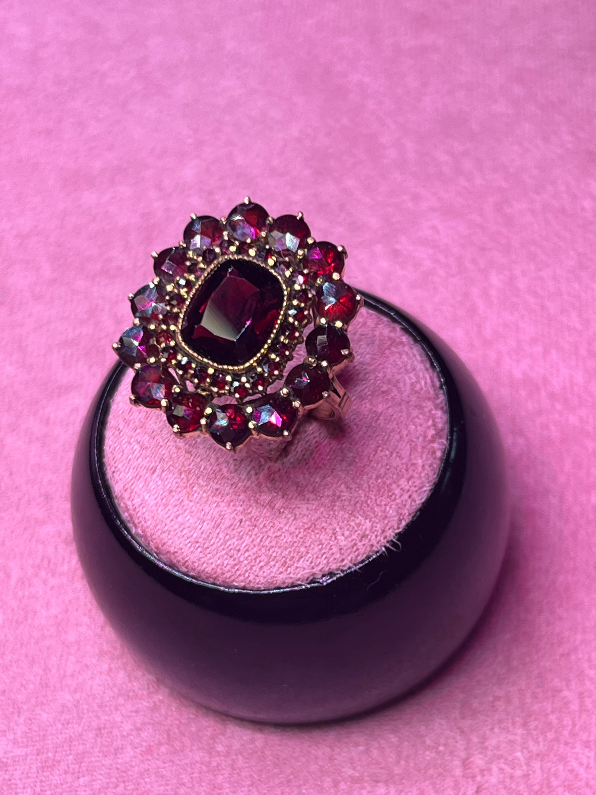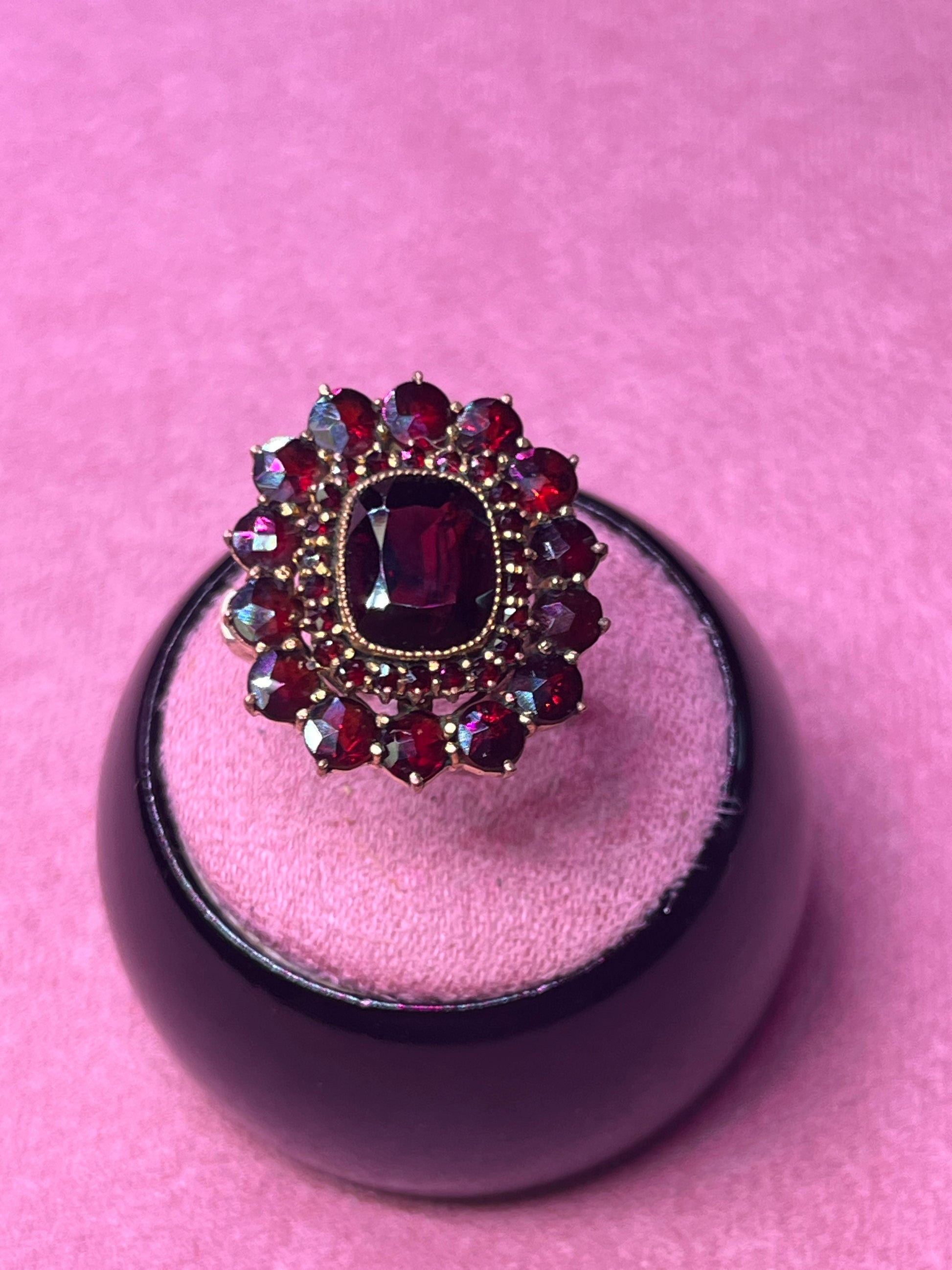 This Authentic Vintage Bohemian garnet ring features a stunning cluster of deep red garnets, expertly set in a vintage gold-tone setting.
