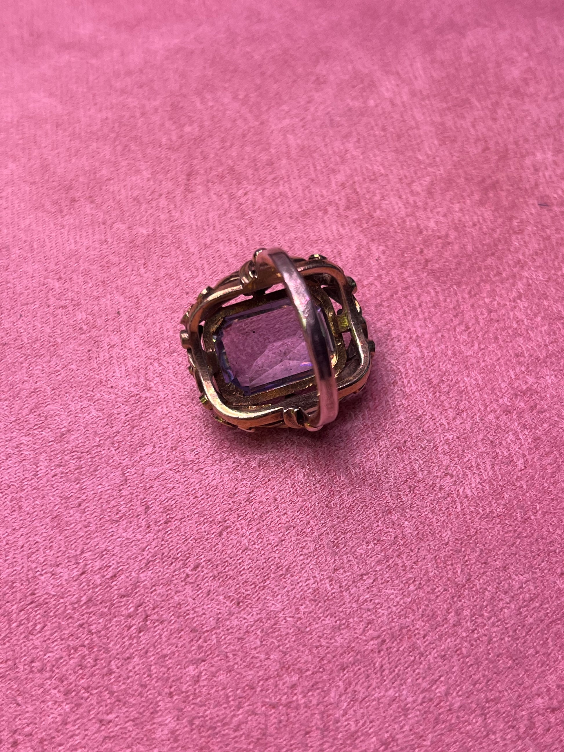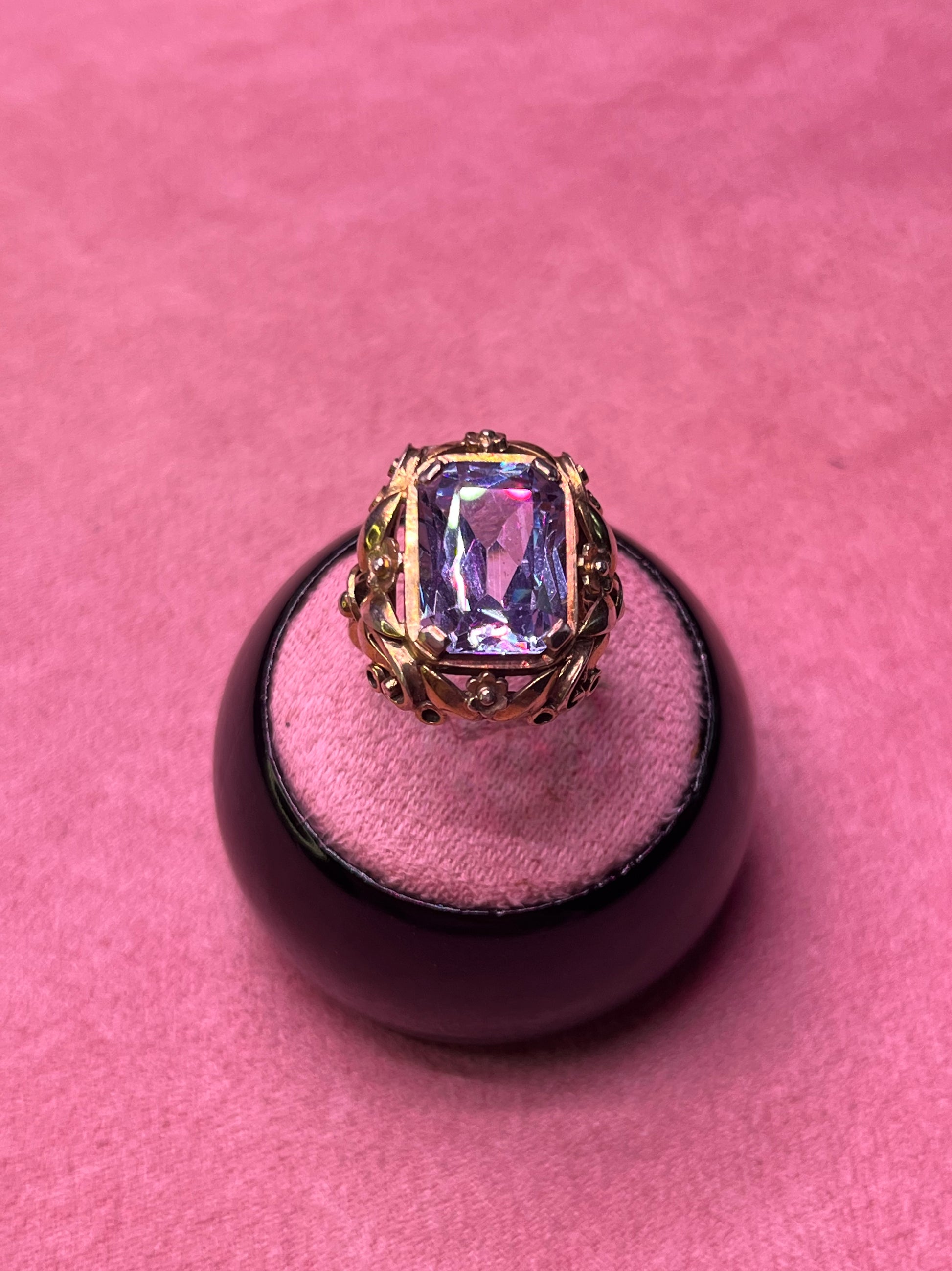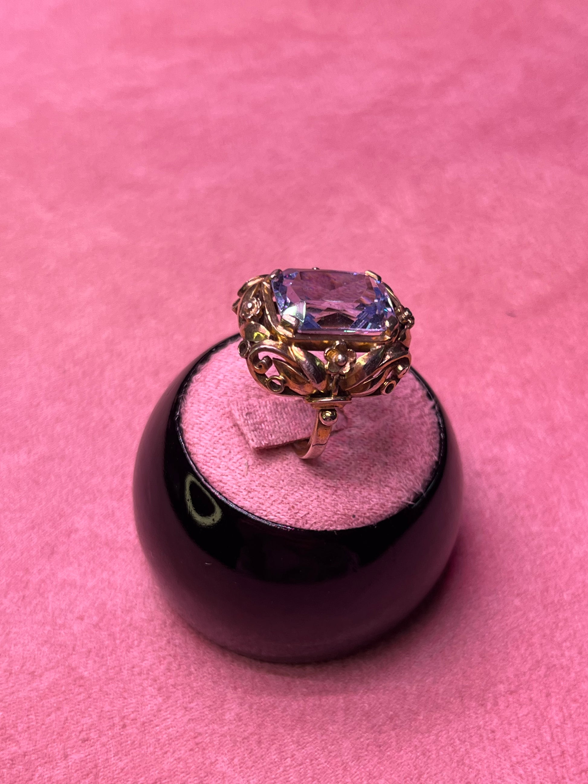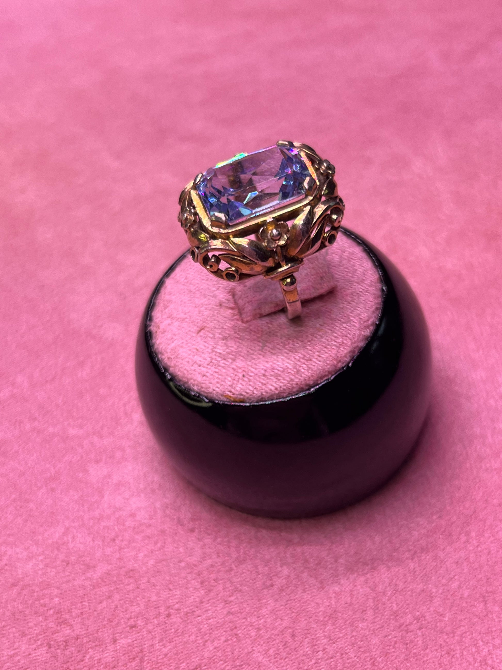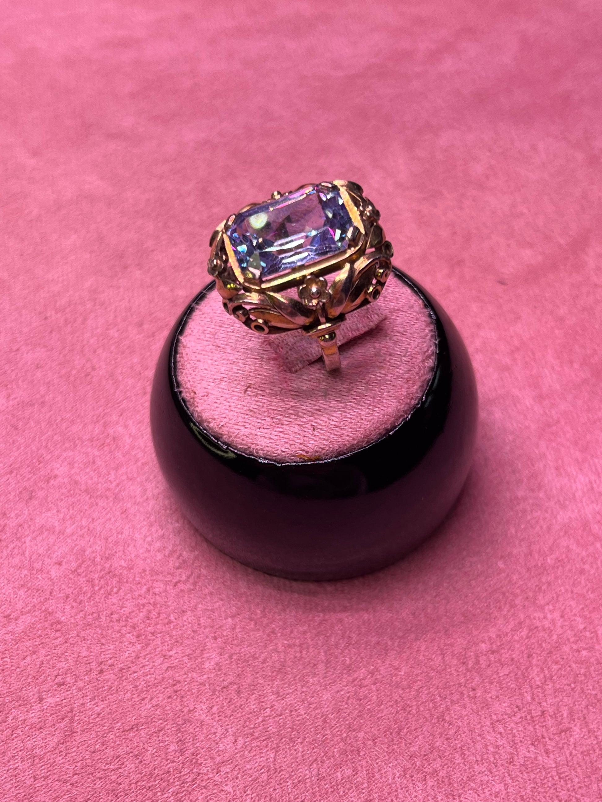 Vintage 1930's sterling silver ring with a gold wash, featuring a stunning genuine aquamarine stone. The aquamarine’s light blue hue is beautifully complemented by the elegant setting. In great vintage condition with soft patina, adding character to this timeless piece.